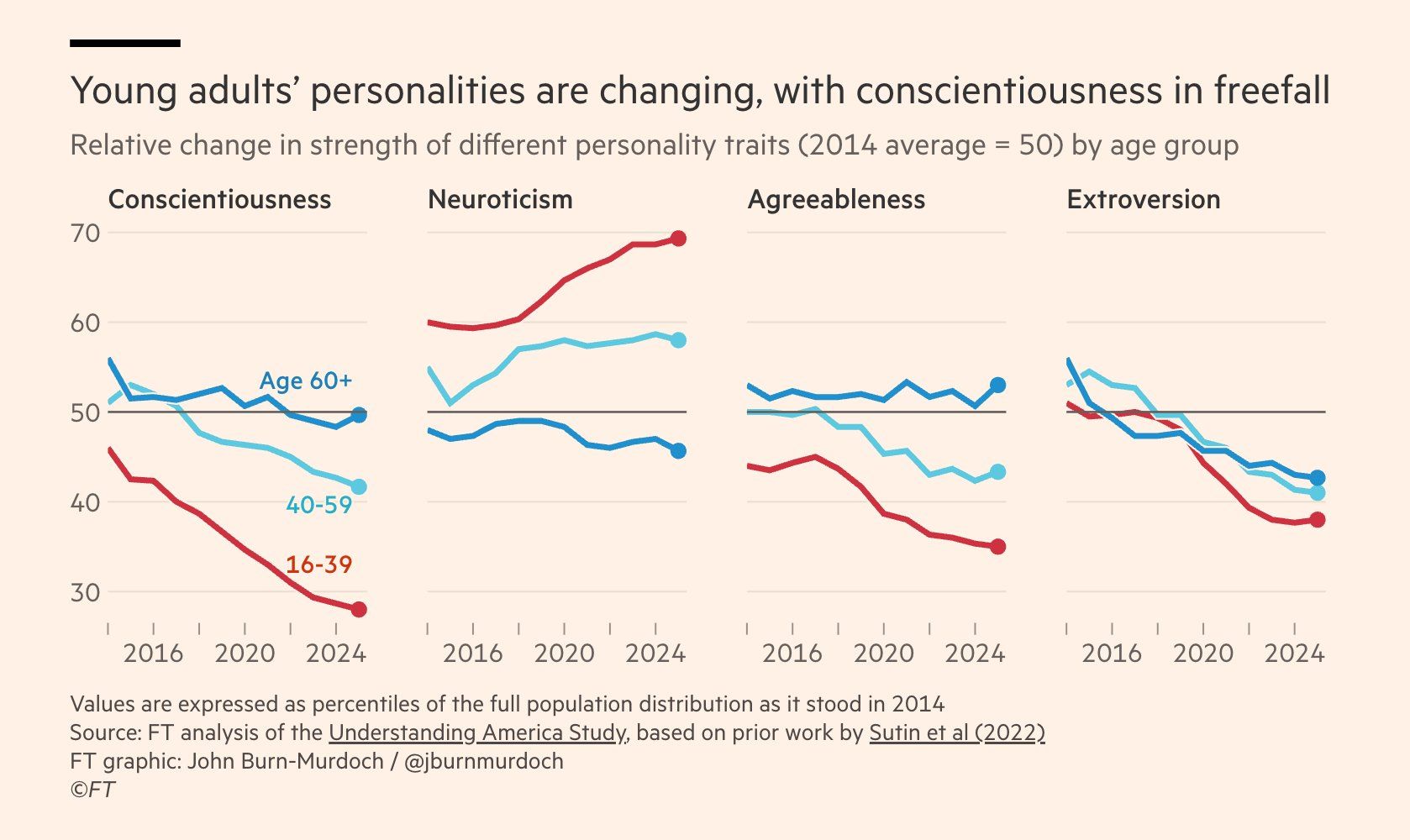 This new data about the changing personalities of Gen Z relative to other generations is alarming people on most corners of the Internet today. Revealed in a Financial Times article, the new research shows that conscientiousness is plummeting among young adults, with neurotism surging.